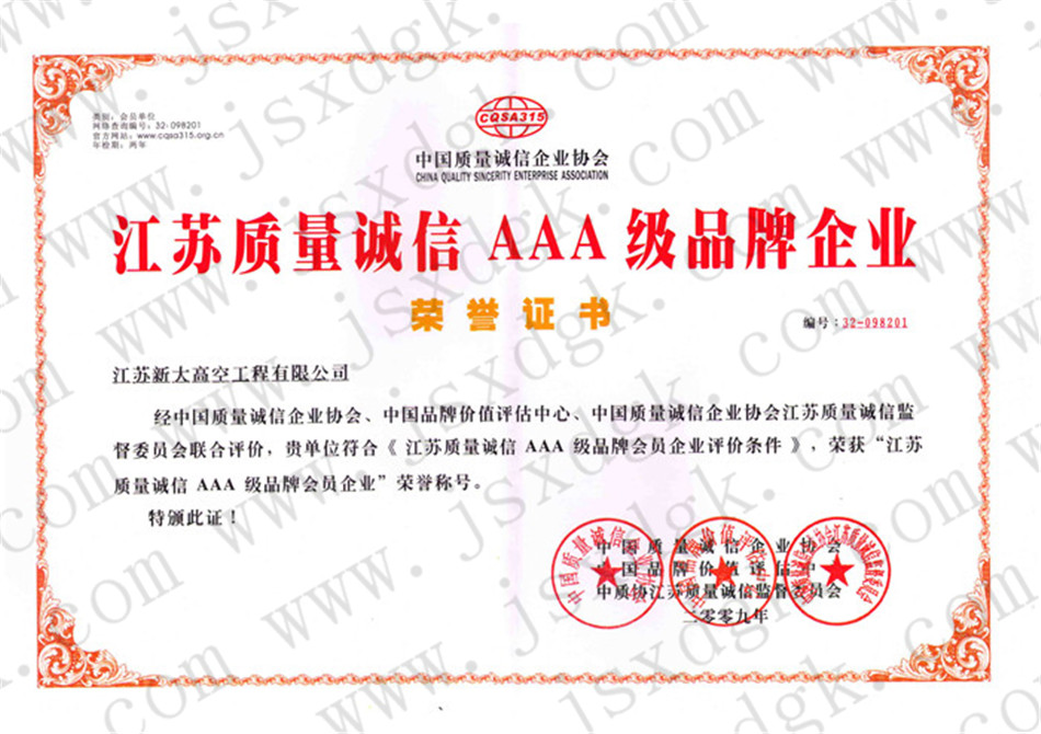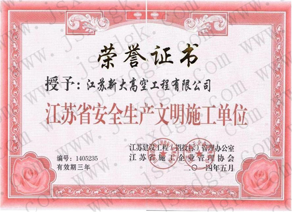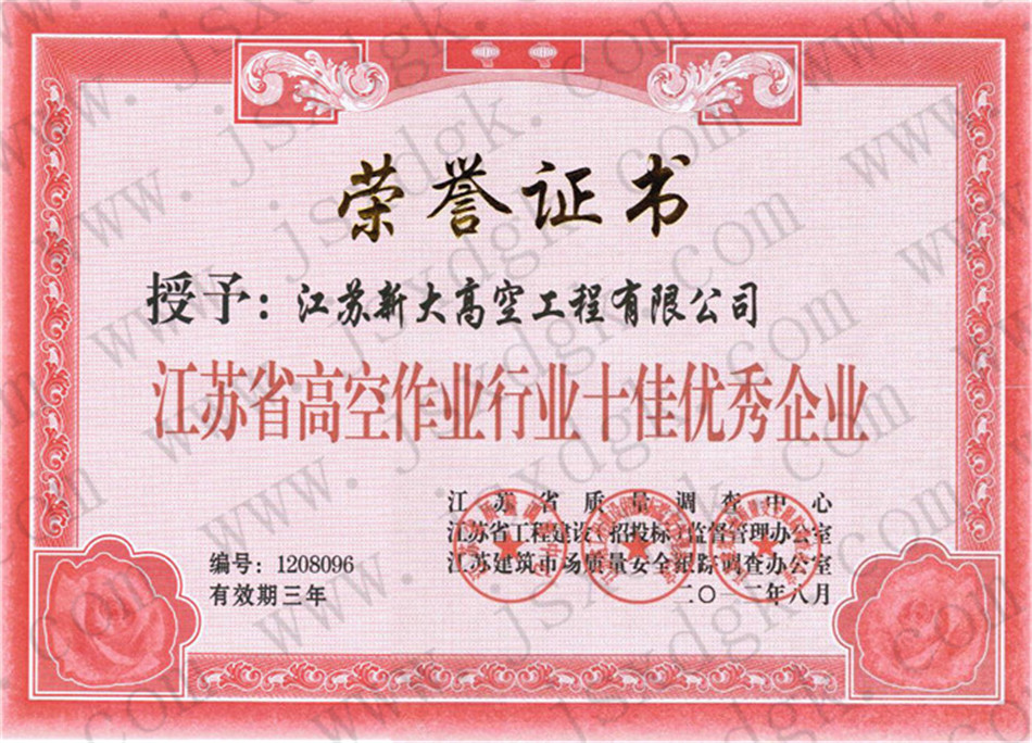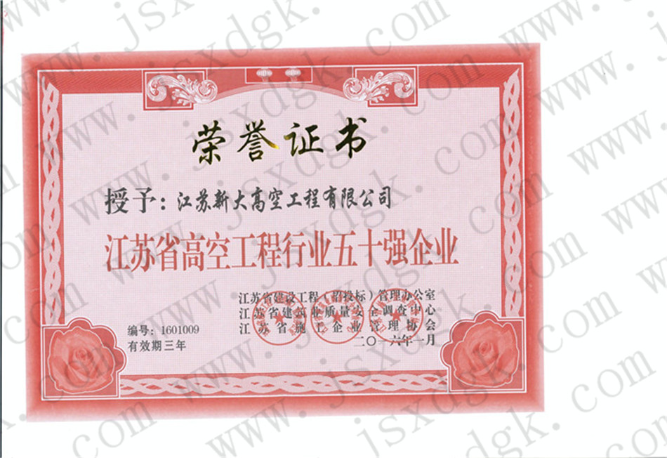 江蘇省高空行業(yè)五十強行業(yè)證書